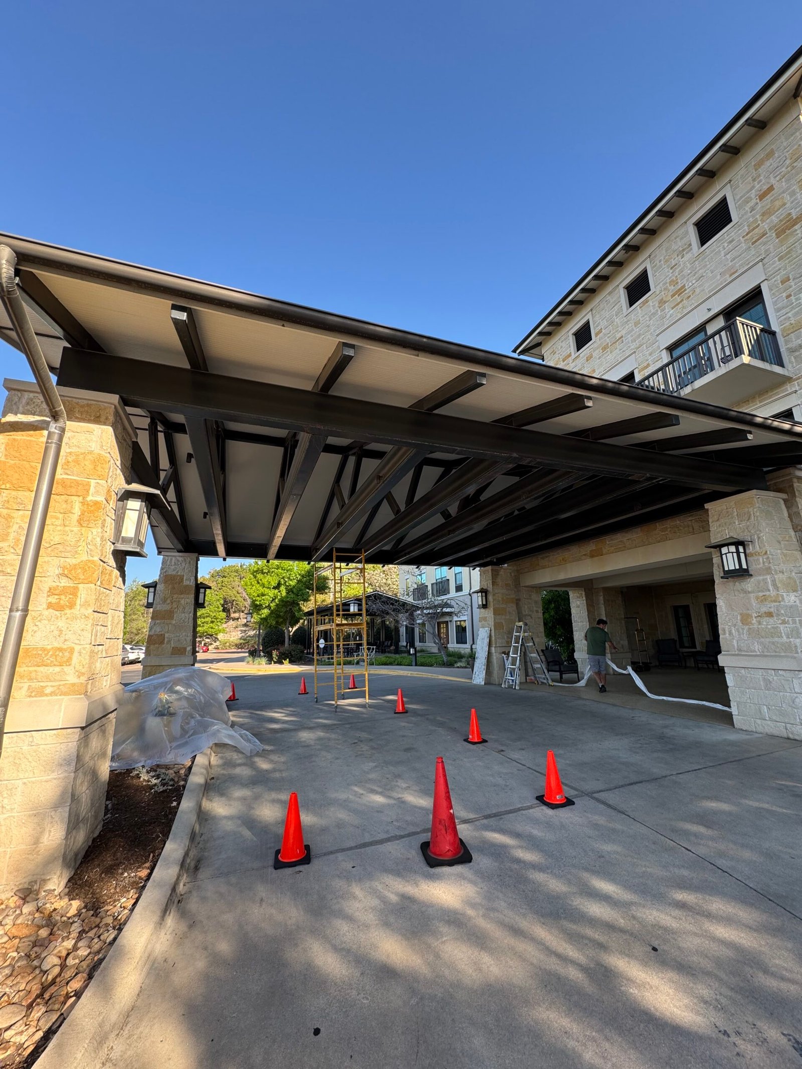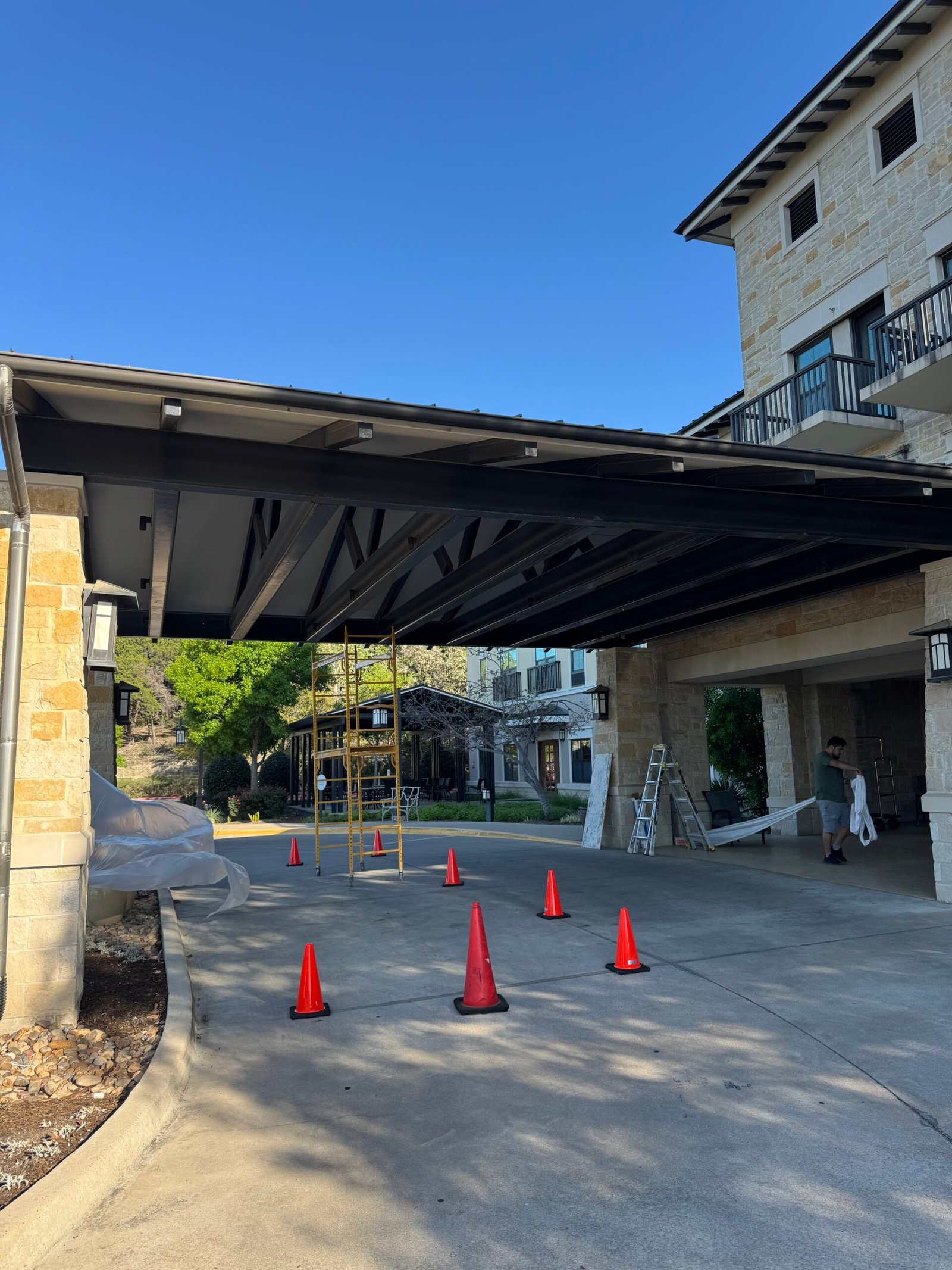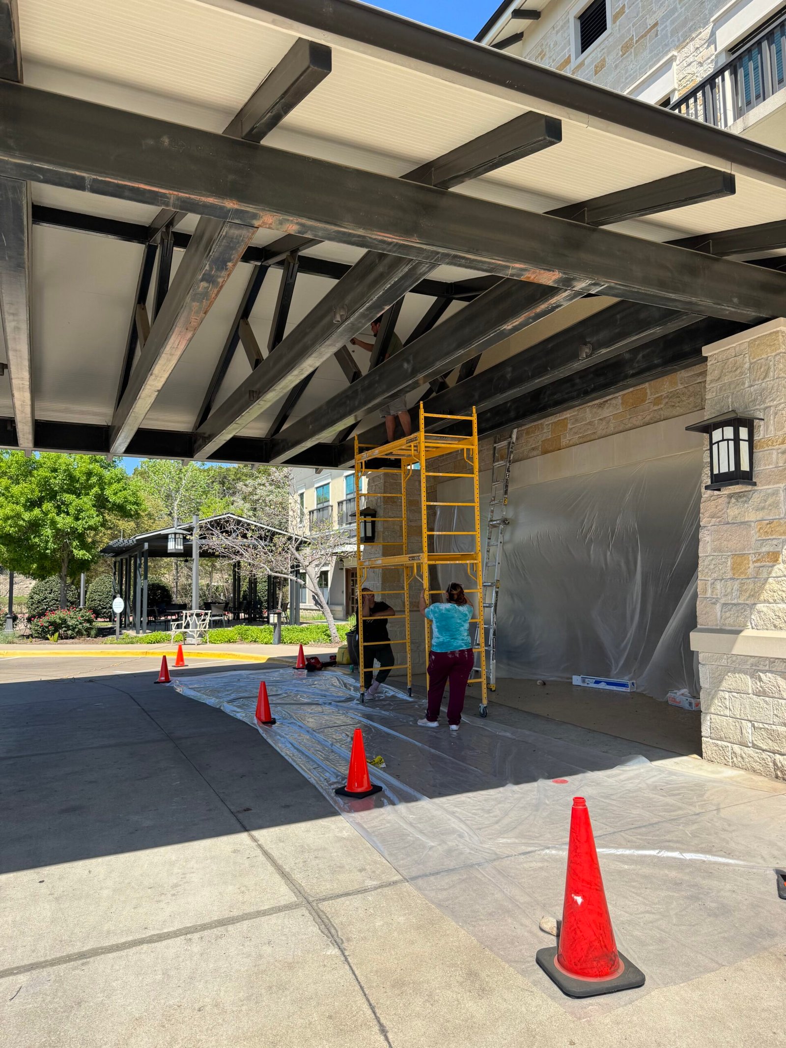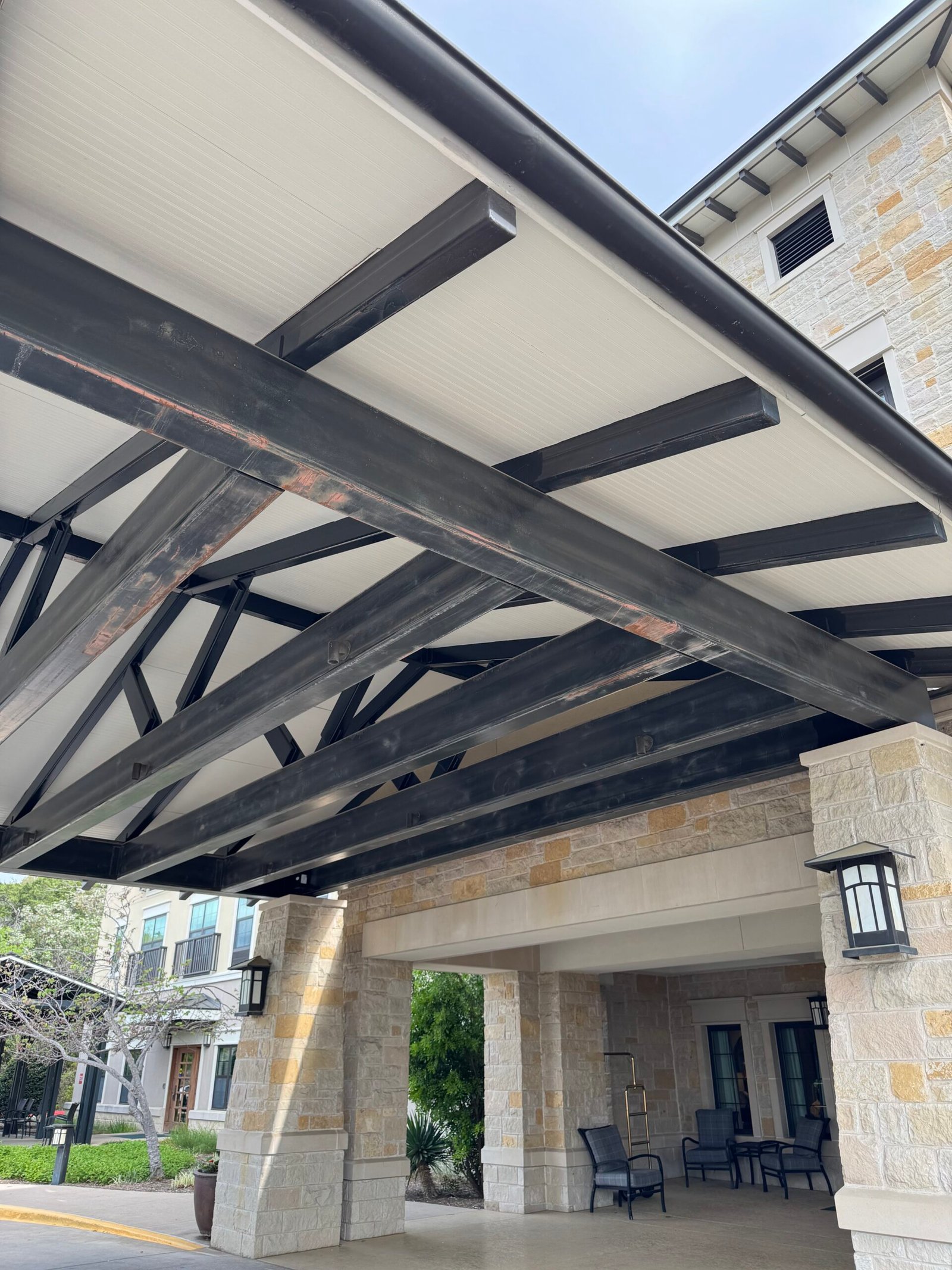 Our team thoroughly prepped all metal surfaces by scraping away rust and imperfections, followed by priming and repainting the canopy to match the property’s bronze finish.
