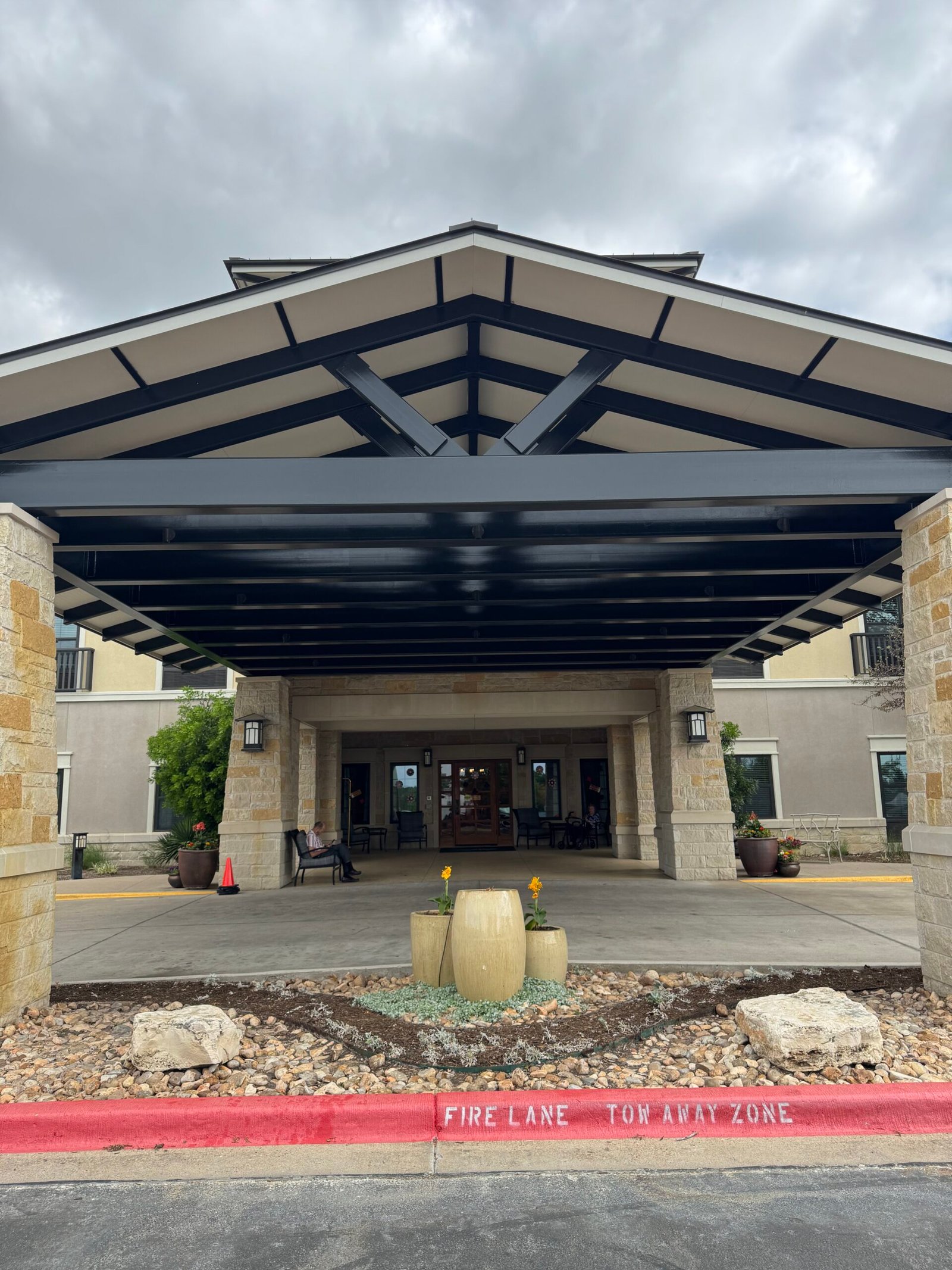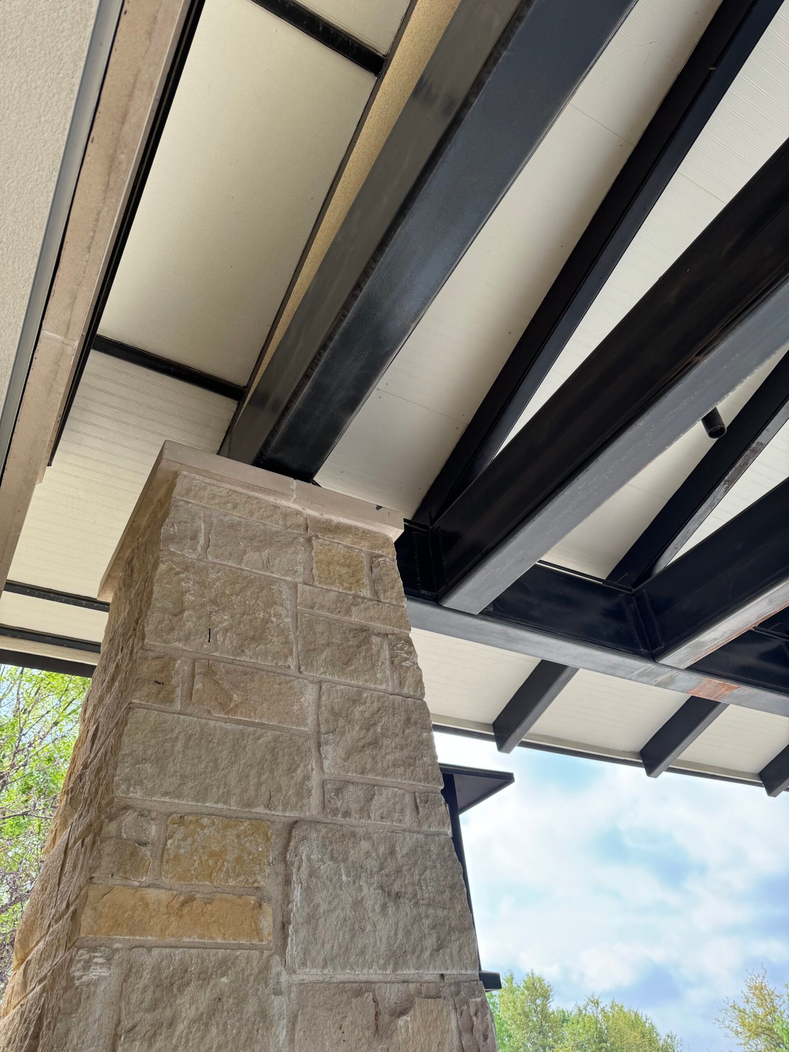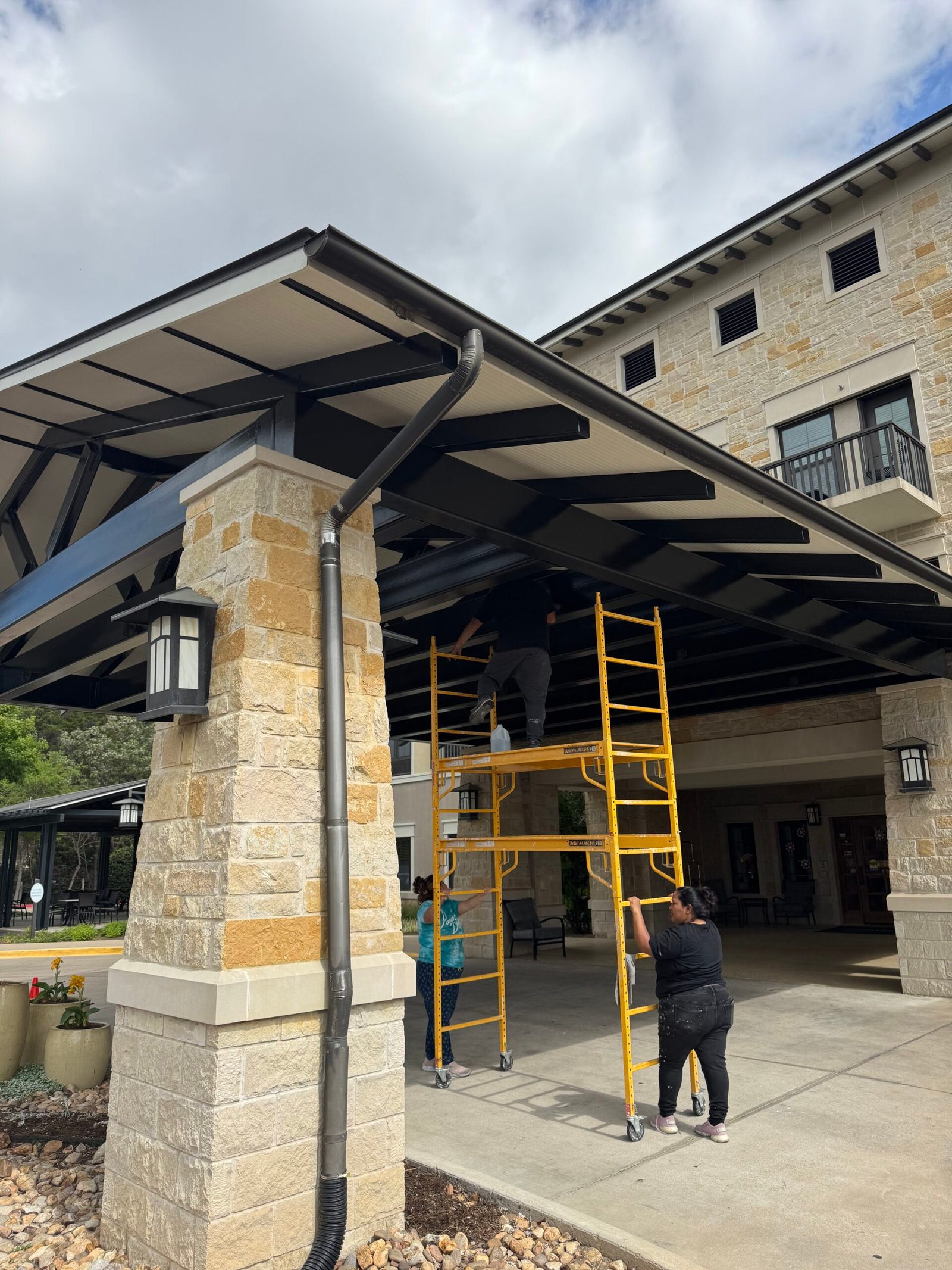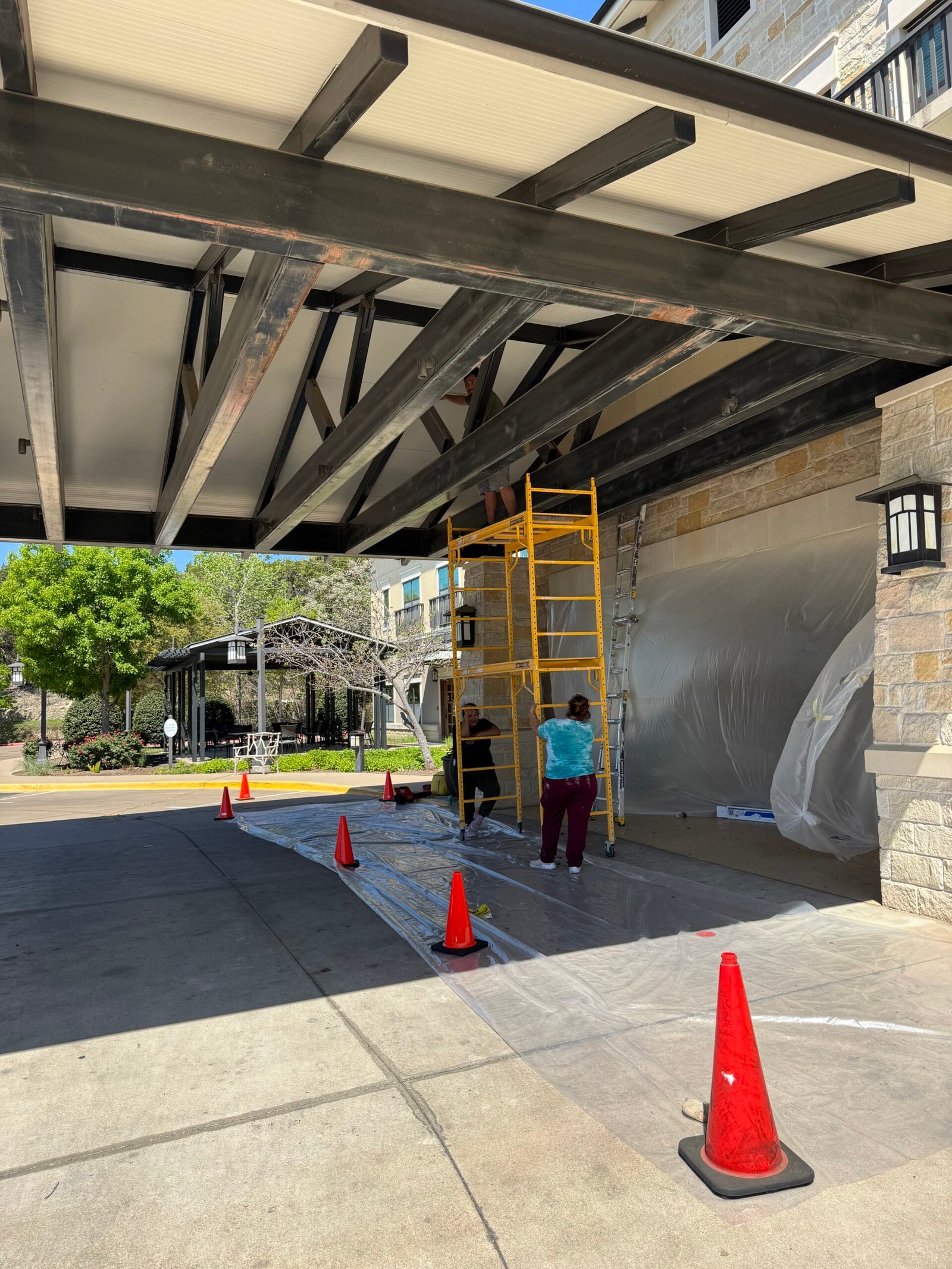 Our team thoroughly prepped all metal surfaces by scraping away rust and imperfections, followed by priming and repainting the canopy to match the property’s bronze finish.